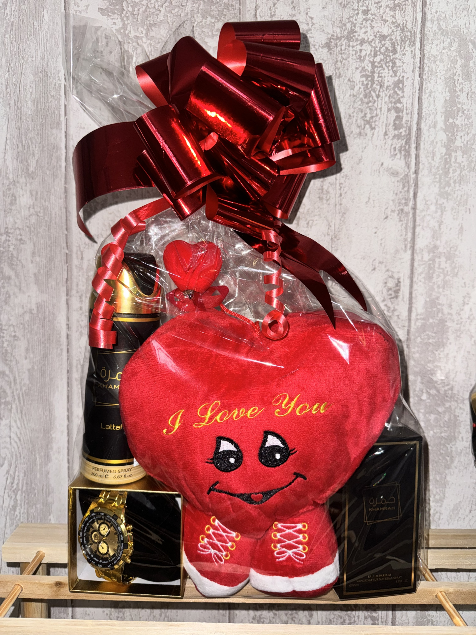 Peluche corazón, perfume kamrah 50ml desodorante y reloj , lleva bolígrafo con forma corazón que tiene luz led ( SE PUEDE HACER CON CUALQUIER PERFUME QUE TE GUSTE)